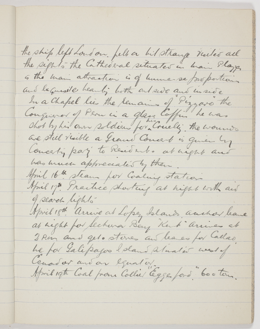 April 18th Arrive at Lopez Islands anchor leave at night for Sechuna Bay "Kent" arrives at 2 p.m. and gets stores and leaves for Callao, we for Galipagos [Galapagos] Island situated west of Ecuador and on equator.