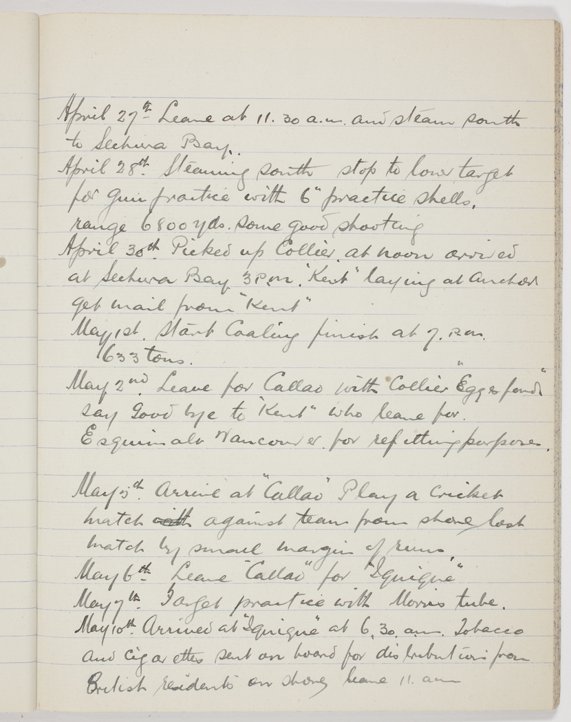May 2nd Leave for Callao with Collier "Eggesford" say Goodbye to "Kent" who leave for Esquimalt Vancouver for refitting purposes.