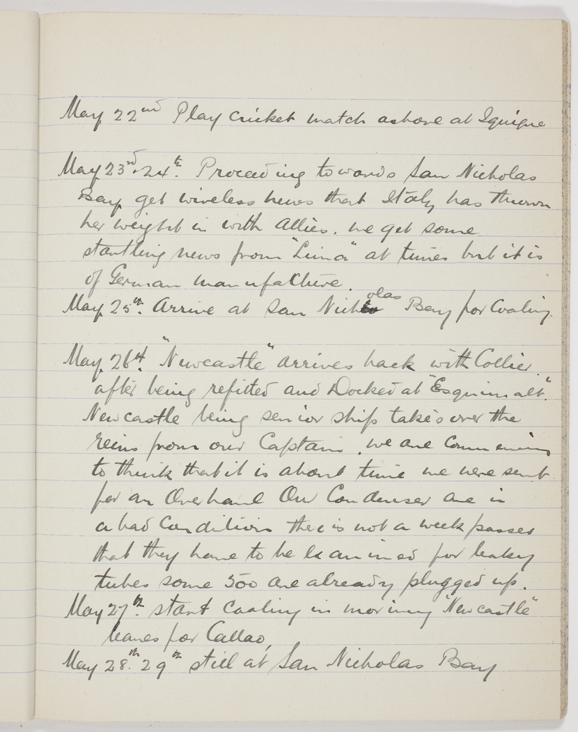 May 23rd & 24th Proceeding towards San Nicholas Bay get wireless news that Italy has thrown her weight in with Allies. we get some startling news from "Lima" at times but it is of German manufacture.