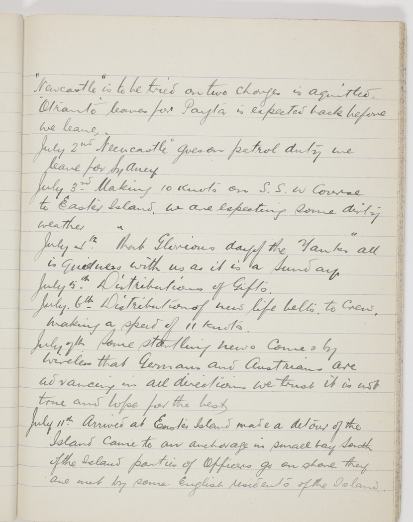 July 3rd Making 10 knots on S.S.W.[South-southwesterly] course to Easter Island. We are expecting some dirty weather