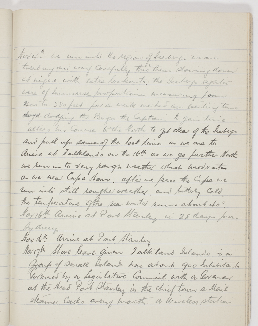 Nov 4th We run into the region of Icebergs we are treading our way carefully thro' them slowing down at night with extra lookouts. the Icebergs sighted were of immense proportions measuring from 400 to 580 feet for a week we had an exciting time dogi dodging the Bergs the Captain to gain time alters his course to the North to get clear of the Icebergs and pull up some of the lost time as we are to Arrive at Falklands on the 16th as we go further North we run into very rough weather which moderates as we near Cape Horn. after we pass the Cape we run into still rougher weather and bitterly cold. the temperature of the sea water runs about 40 °