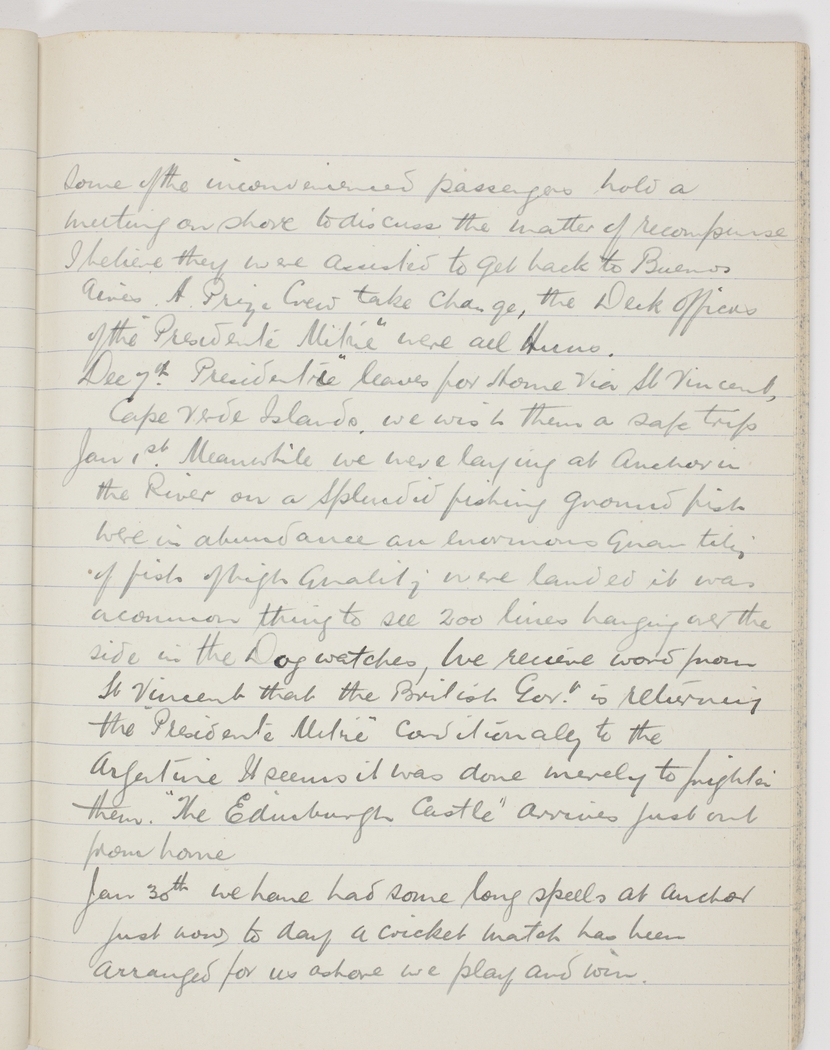 Jan 1st [1916] Meanwhile we were laying at Anchor in the River on a Splendid fishing ground fish were in abundance an enormous quantity of fish of high quality were landed it was a common thing to see 200 lines hanging over the side in the Dog watches, We receive word from St Vincent that the British Govt is returning the "Presidente Mitre" conditionally to the Argentine It seems it was done merely to firighten them. "The Edinburgh Castle" arrives just out from home