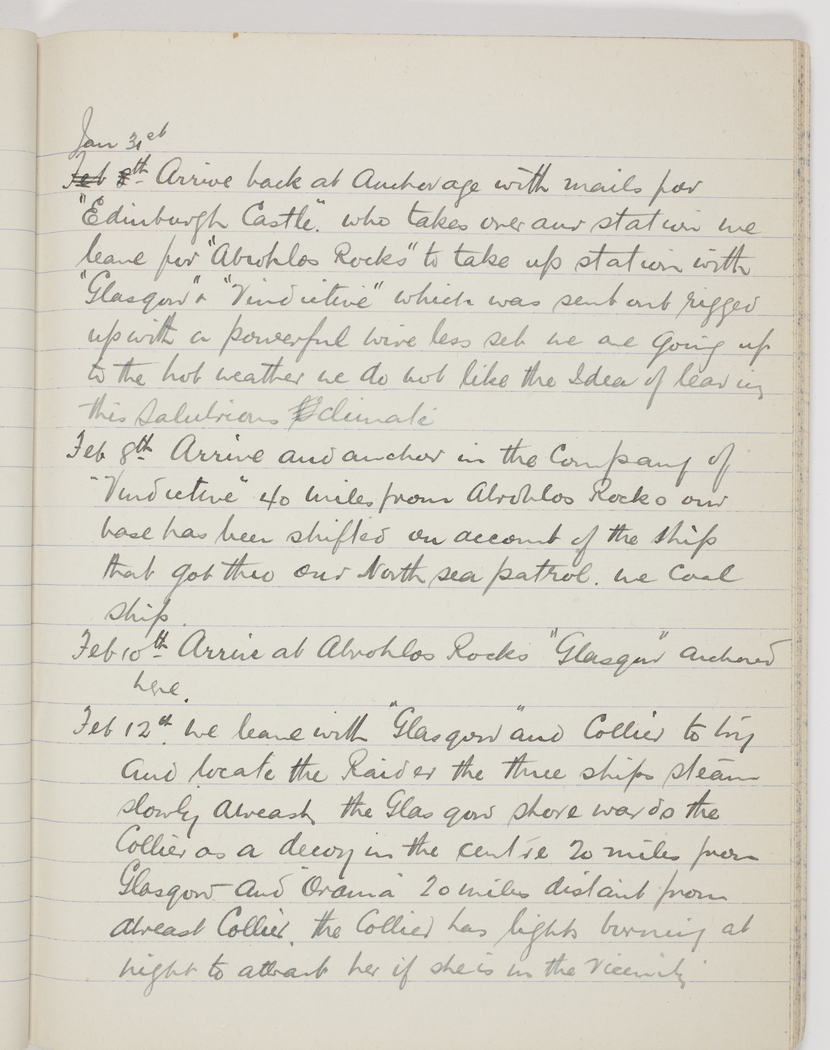 Feb 8th Jan 31st Arrive back at Anchorage with mails for "Edinburgh Castle" who takes over our station we leave for "Abrohlos Rocks" to take up station with "Glasgow" & "Vindictive" which was sent and rigged up with a powerful wireless set we are going up to the hot weather we do not like the Idea of leaving this Salubrious climate