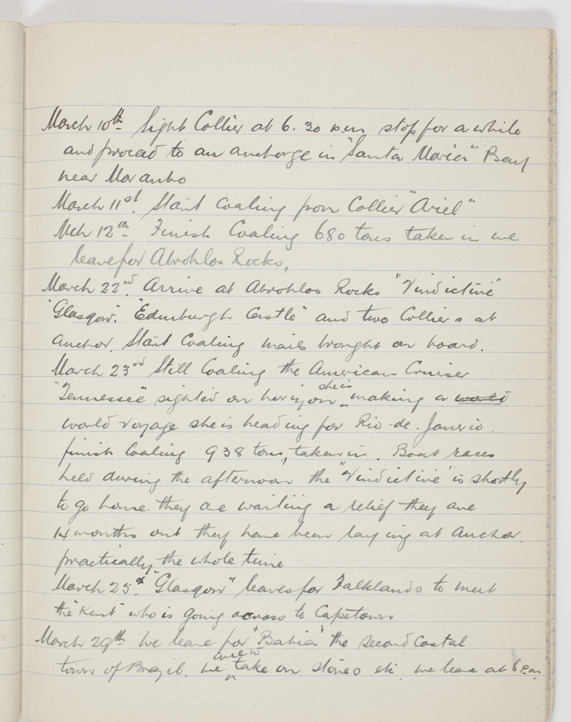 March 22nd Arrive at Abrohlos Rocks "Vindictive" "Glasgow" "Edinburgh Castle" and two Colliers at anchor. Start coaling mails brought on board.