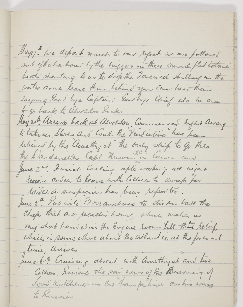 May 30th. Arrived back at Abrohlos. Commenced right away to take in Stores and Coal the "Vindictive" has been relieved by the "Amethyst" the only ship to go thro' the Dardenelles. Capt Unwin V.C. in Command