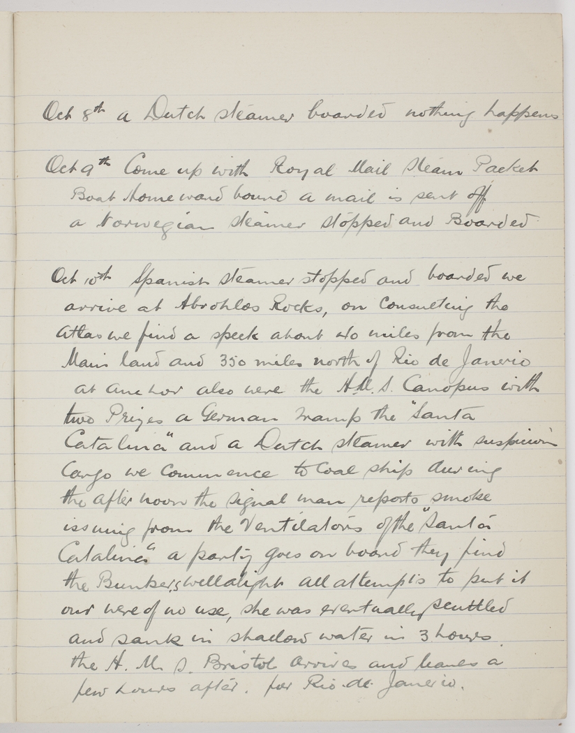 Oct 10th Spanish steamer stopped and boarded  we arrive at Abrohlos [Abrolhas] Rocks, on consulting the atlas we find a speck about 40 miles from the mainland and 350 miles north of Rio de Janerio at anchor also were the H.M.S. Canopus with two prizes a German Tramp the "Santa Catalina" and a Dutch steamer with suspicious cargo  We commence to coal ship during the afternoon the signal man reports smoke issuing from the ventilations of the "Santa Catalina" a party goes on board they find the bunkers well alight all attempts to put it out were of no use, she was eventually scuttled and sank in shallow water in 3 hours. The H.M.S. Bristol arrives and leaves a few hours after for Rio de Janerio.