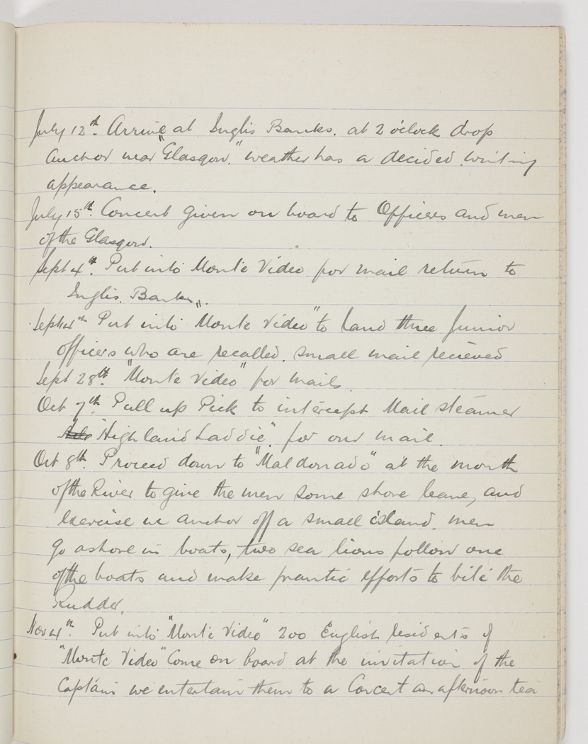 Nov 4th. Put into "Monte Video" 200 English residents of "Monte Video" come on board at the invitation of the Captain we entertain them to a Concert and afternoon tea
