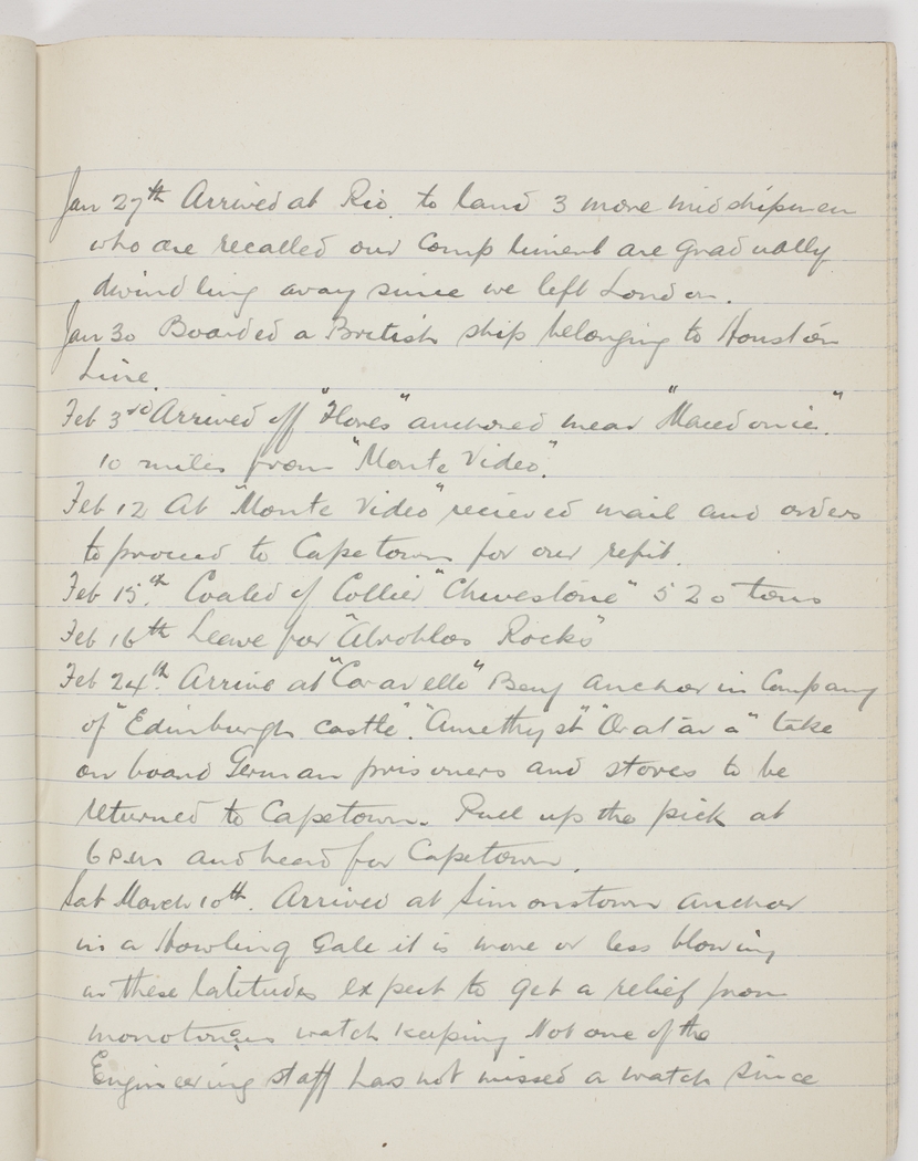 Feb 24th. Arrive at "Caravelle" Bay anchor in Company of "Edinburgh Castle" "Amethyst" "Oratara" take on board German prisoners and stores to be returned to Capetown. Pull up the pick at 6 p.m. and head for Capetown