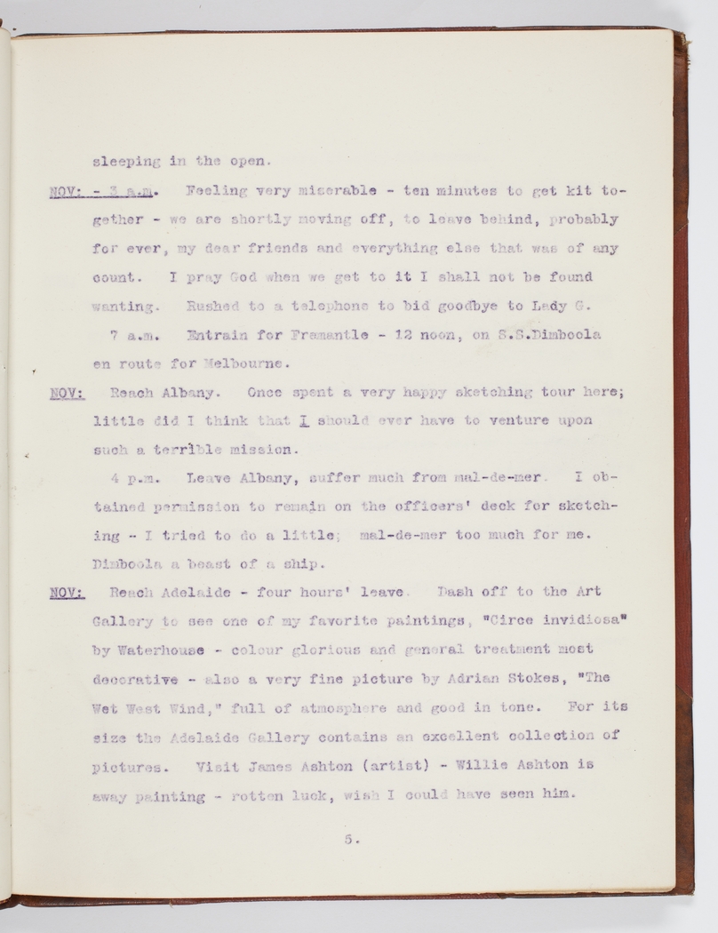 Reach Adelaide – four hours's leave. Dash off to the Art Gallery to see one of my favourite paintings, "Circe invidiosa" by Waterhouse – colour glorious and general treatment most decorative – also a very fine picture by Adrian Stokes, "The Wet West Wind," full of atmosphere and good in tone. For its size the Adelaide Gallery contains an excellent collection of pictures. Visit James Ashton (artist) – Willie Ashton is away painting – rotten luck, wish I could have seen him.