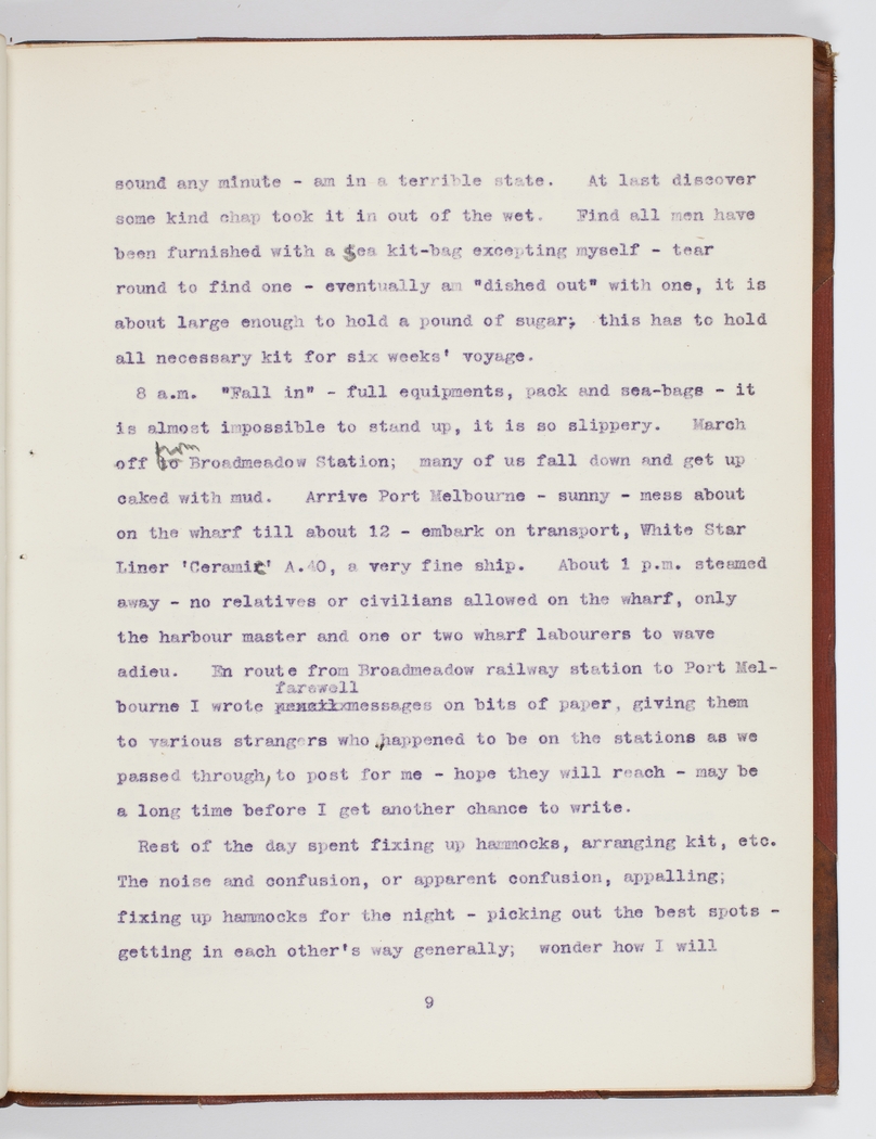 8 a.m. "Fall in " – full equipments, pack and sea -bags – it is almost impossible to stand up, it is so slippery. March off from Broadmeadow Station; many of us fall down and get up caked with mud. Arrive Port Melbourne – sunny – mess about on the wharf till about 12 – embark on transport, White Star Liner 'Ceramic' A.40, a very fine ship. About 1 p.m. steamed away – no relatives or civilians allowed on the wharf, only the harbour master and one or two wharf labourers to wave adieu. En route from Broadmeadow railway station to Port Melbourne I wrote farewell messages on bits of paper, giving them to various strangers who happened to be on the stations as we passed through, to post for me – hope they will reach – may be a long time before I get another chance to write.