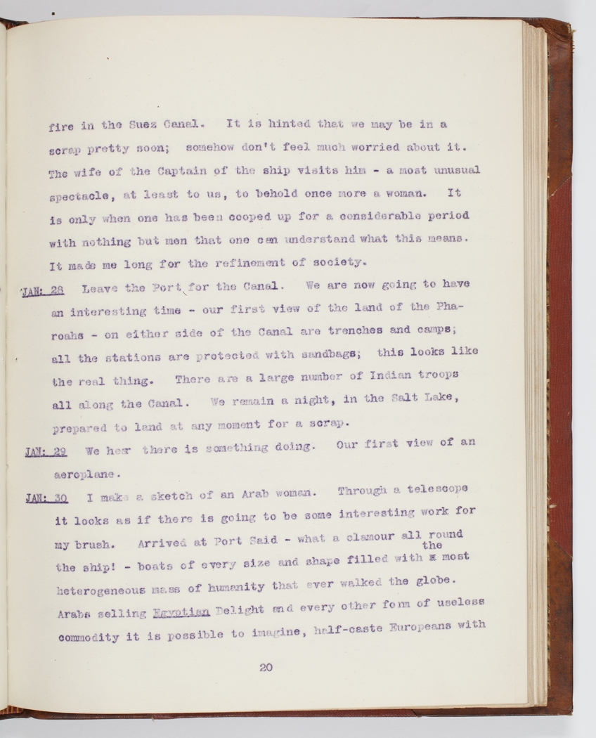 Leave the Port for the Canal. We are now going to have an interesting time – our first view of the land of the Pharoahs – on either side of the Canal are trenches and camps; all the stations are protected with sandbags; this looks like the real thing. There are a large number of Indian troops all along the Canal. We remain a night, in the Salt Lake, prepared to land at any moment for a scrap.