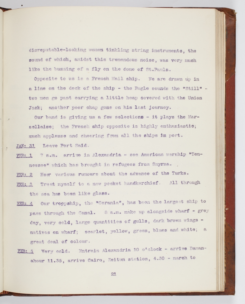Opposite to us is a French ship. We are drawn up in a line on the deck of the ship – the Bugle sounds the "Still" – two men go past carrying a little heap covered with the Union Jack; another poor chap gone on his last journey.