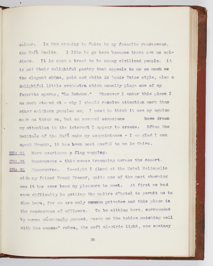 Manoeuvres. Tonight I dined at the Hotel Heliopolis with my friend Frank Fraser, quite one of the most charming men it has ever been my pleasure to meet. At first we had some difficulty in getting the maitre d'hotel to permit us to dine here, for we are only privates and this place is the rendezvous of officers. To be sitting here, surrounded by women charmingly gowned, roses on the tables matching well with the womens' robes, the soft electric light, was ecstasy