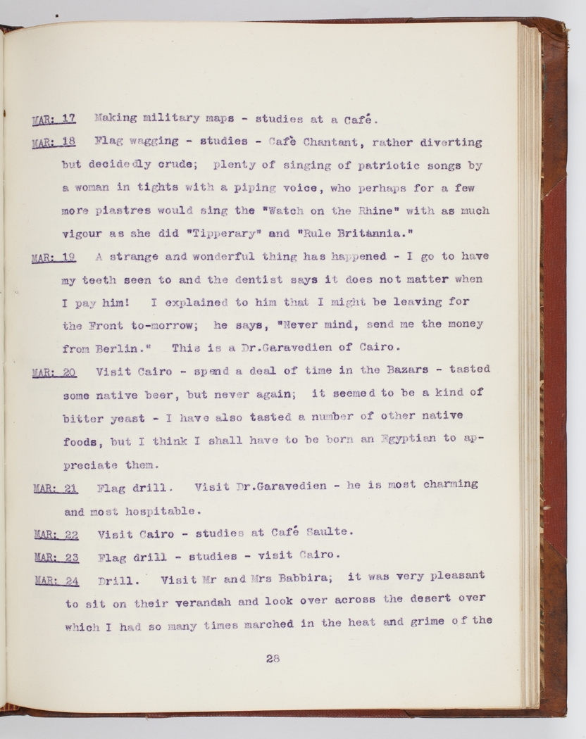 Flag wagging – studies – Café Chantant, rather diverting but decidedly crude plenty of singing of patriotic songs by a woman in tights with a piping voice, who perhaps for a few more piastres would sing the "Watch on the Rhine" with as much vigour as she did "Tipperary" and "Rule Britannia."
