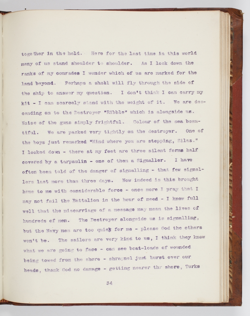 The Destroyer alongside us is signalling, but the Navy men are too quick for me – please God the others won't be. The sailors are very kind to us, I think they know what we are going to face – can see boat-loads of wounded being towed from the shore – shrapnel just burst over our heads, thank God no damage – getting nearer the shore, Turks
