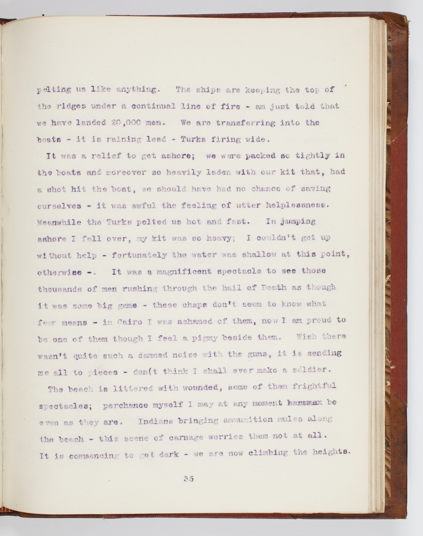 It was a magnificent spectacle to see those thousands of men rushing through the hail of Death as though it was some big game – these chaps don't seem to know what fear means – in Cairo l was ashamed of them, now I am proud to be one of them though I feel a pigmy beside them.
