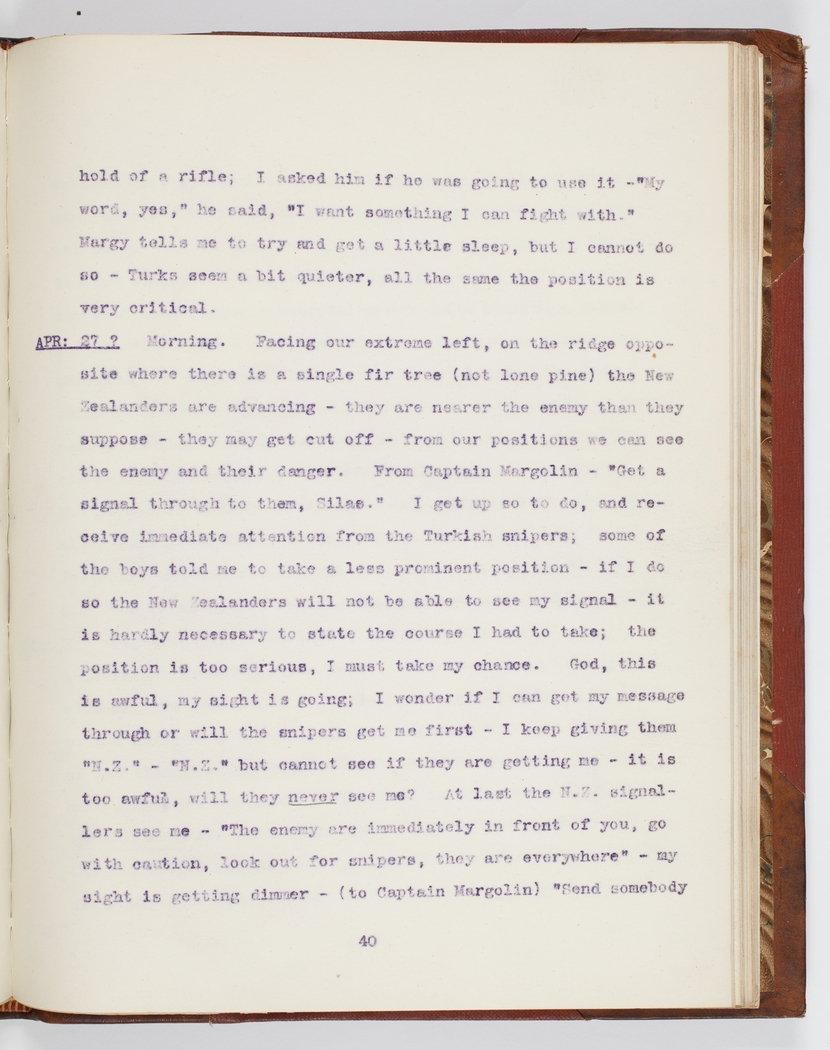 From Captain Margolin – "Get a signal through to them, Silas." I get up so to do, and receive immediate attention from the Turkish snipers; some of the boys told me to take a less prominent position – if I do so the New Zealanders will not be able to see my signal – it is hardly necessary to state the course I had to take; the position is too serious, I must take my chance. God, this is awful, my sight is going; I wonder if I can get my message through or will the snipers get me first – I keep giving them "N.Z." – "N.Z." but cannot see if they are getting me – it is too awful, will they never see me?