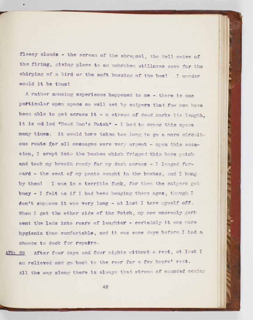 A rather amusing experience happened to me – there is one particular open space so well set by snipers that few men have been able to get across it – a stream of dead marks its length, it is called "Dead Man's Patch" – I had to cross this space many times; it would have taken too long to go a more circuitous route for all messages were very urgent – upon this occasion, I crept into the bushes which fringed this bare patch and took my breath ready for my dash across – I lunged forward – the seat of my pants caught in the bushes, and I hung by them! I was in a terrible funk, for then the snipers got busy – I felt as if I had been hanging there ages, though I don't suppose it was very long – at last I tore myself off.