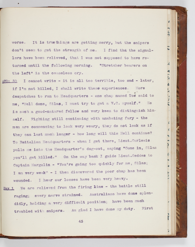 On the way back I guide Lieut.Geddes to Captain Margolin – "You're going too quickly for me, Silas; I am very weak" – I then discovered the poor chap has been wounded. I hear our losses have been very heavy.