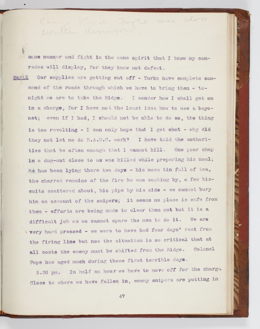 Our supplies are getting cut off – Turks have complete command of the roads through which we have to bring them – to-night we are to take the Ridge. I wonder how I shall get on in a charge, for I have not the least idea how to use a bayonet; even if I had, I should not be able to do so, the thing is too revolting – I can only hope that I get shot – why do they not let me do R.A.M.C. work? I have told the authorities that be often enough that I cannot kill.