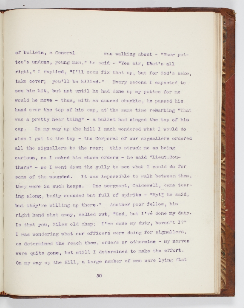 of bullets, a General was walking about – "Your puttee's undone, young man, " he said – "Yes sir, that's all right, " I replied, "I'll soon fix that up, but for God's sake, take cover; you'll be killed." Every second I expected to see him hit, but not until he had done up my puttee for me would he move – then, with an amused chuckle, he passed his hand over the top of his cap, at the same time remarking "That was a pretty near thing" – a bullet had singed the top of his cap.