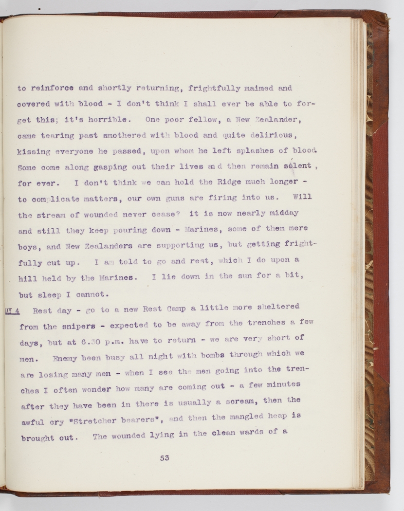 Will the stream of wounded never cease? It is now nearly midday and still they keep pouring down – Marines, some of them mere boys and New Zealanders are supporting us, but getting frightfully cut up.