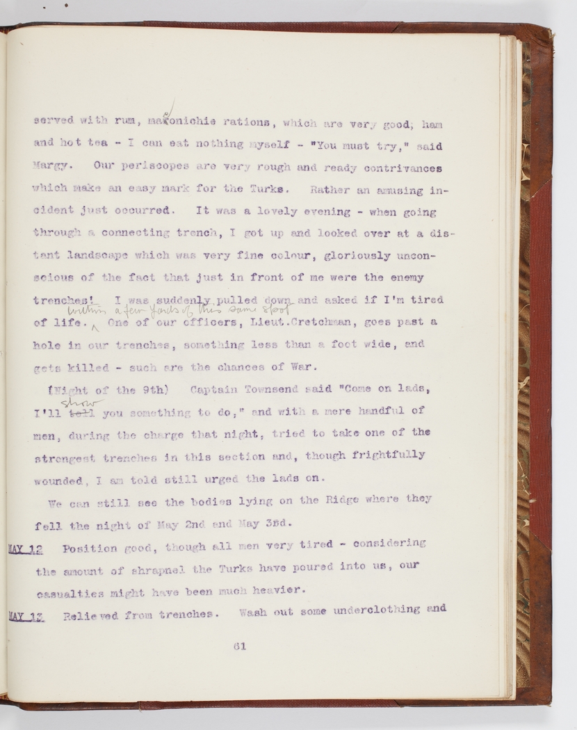 Rather an amusing incident just occurred. It was a lovely evening – when going through a connecting trench, I got up and looked over at a distant landscape which was very fine colour, gloriously unconscious of the fact that just in front of me were the enemy trenches; I was suddenly pulled down and asked if I'm tired of life. Within a few yards of this same spot one of our officers, Lieut. Cretchman, goes past a hole in our trenches, something less than a foot wide, and gets killed – such are the chances of war.