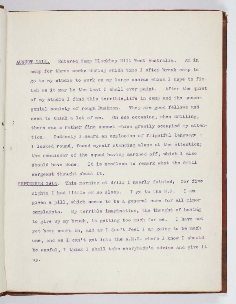 Entered Camp Blackboy Hill West Australia. Am in camp for three weeks during which time I often break camp to go to my studio to work on my large canvas which I hope to finish as it may be the last I shall ever paint. After the quiet of my studio I find this terrible, life in camp and the uncongenial society of rough Bushmen. They are good fellows and seem to think a lot of me. On one occasion, when drilling, there was a rather fine sunset which greatly occupied my attention. Suddenly I head an explosion of frightful language - I looked round, found myself standing alone at the attention; the remainder of the squad having marched off, which I also should have done. It is needless to remark what the drill sergeant thought about it.