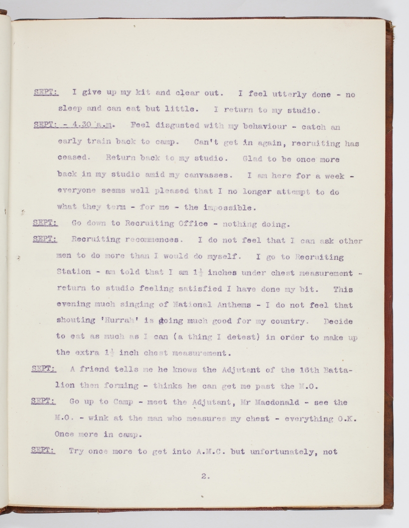 Recruiting recommences. I do not feel that I can ask other men to do more than I would do myself. I go to Recruiting Station – am told that I am 1½ inches under chest measurement – return to studio feeling satisfied I have done my bit.This evening much singing of National Anthems – I do not feel that shouting 'Hurrah' is doing much good for my country. Decide to eat as much as I can (a thing I detest) in order to make up the 1½ inch chest measurement.