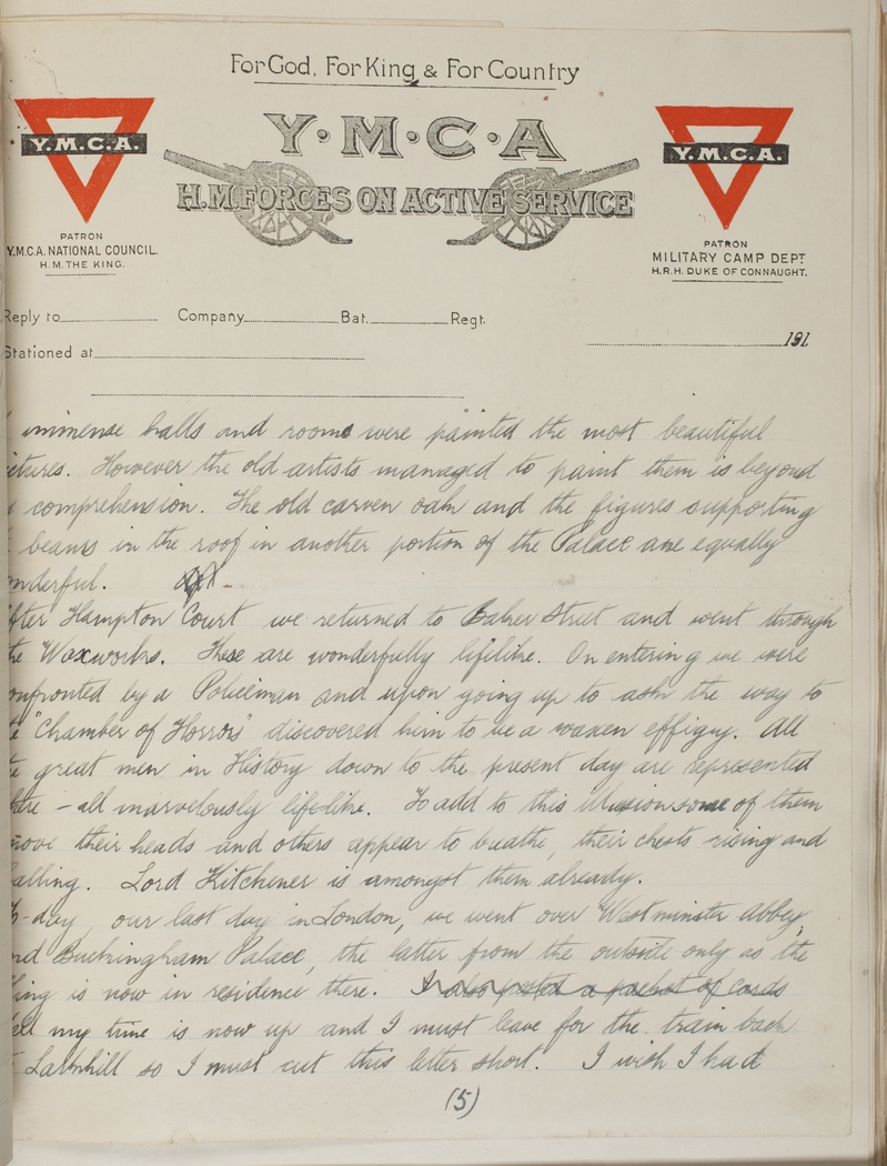 After Hampton Court we returned to Baker Street and went through the Waxworks. These are wonderfully lifelike. On entering we were confronted by a Policeman and upon going up to ask the way to the "Chamber of Horrors" discovered him to be a waxen effigy. All the great men in History down to the present day are represented there - all marvelously lifelike. To add to this illusion some of them move their heads and others appear to breathe, their chests rising and falling. Lord Kitchener is among them already.