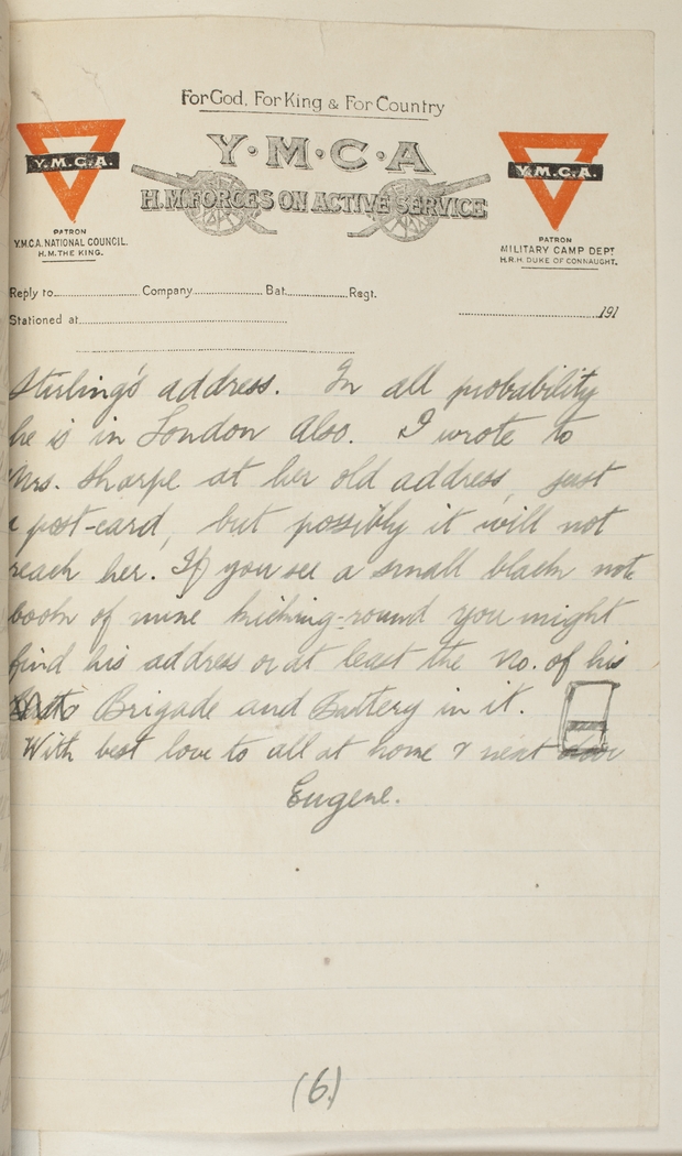 Stirling's address. In all probability he is in London also. I wrote to Mrs. Sharpe at her old address, just a post-card, but possibly it will not reach here. If you see a small black note book of mine kicking-round you might find his address or at least the No. of Brigade and Battery in it.