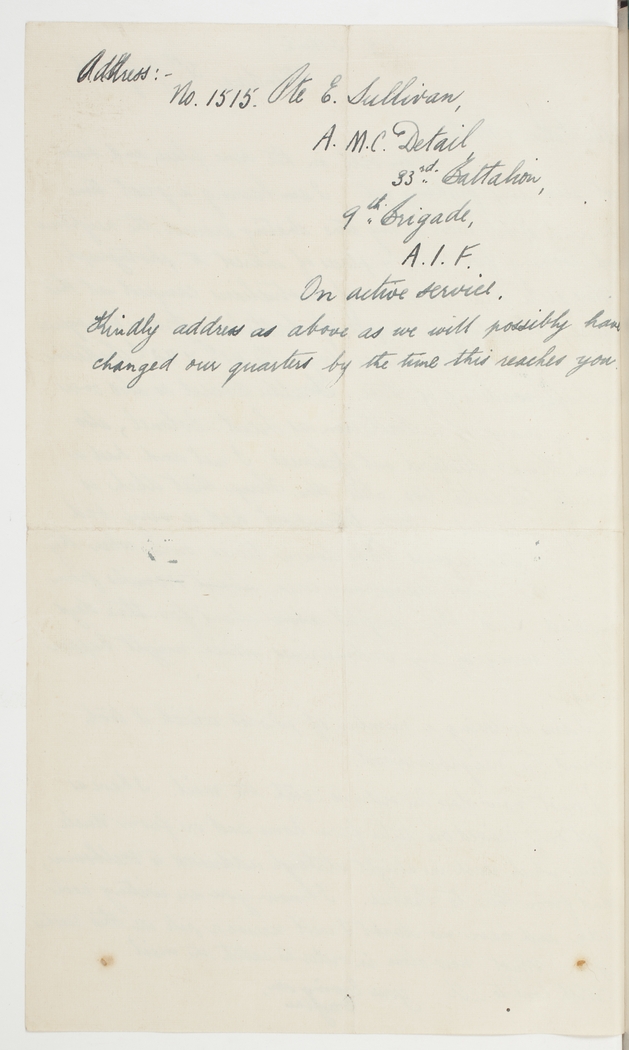 Kindly address as above as we will possibly have changed our quarters by the time this reaches you.