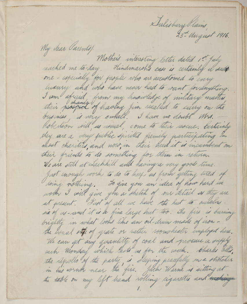 We are still at Larkhill and having a very good time. Just enough work to do to keep us from getting tired of doing nothing. To give you an idea of how hard we work I will give you a sketch of our detail as they are at present. First of all we have the hut to ourselves - six of us - and it is a fine large hut too. The fire is burning brightly in what looks like an oil-drum made of iron - the usual style of grate of rather room-heater used here. We can get any quantity of coal and procure a supply each Monday which lasts us for the week. Charles Ellis, the Apollo of the party, is sleeping peacefully on a stretcher in his corner near the fire. Jack Warne is sitting at the table on my left hand rolling cigarettes and