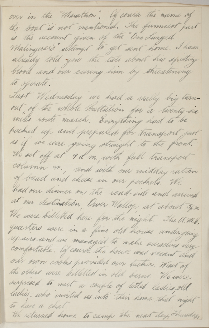 Last Wednesday we had a really big turnout of the whole Battalion for a twenty-six miles route march. Everything had to be packed up and prepared for transport just as if we were going straight to the front. We set off at 9 a.m., with full transport column &c., and with our midday ration of bread and cheese in our pockets. We had our dinner on the road-side and arrived at our destination, Lower Wallop, at about 5 p.m. We were billetted here for the night. The A.M.C. quarters were in a fine old house undergoing repairs and we managed to make ourselves very comfortable. Of course the house was vacant and our own cooks provided our tucker. Most of the others were billetted in old barns. We were surprised to meet a couple of titled ladies, old ladies, who invited us into their home that night to have a chat.