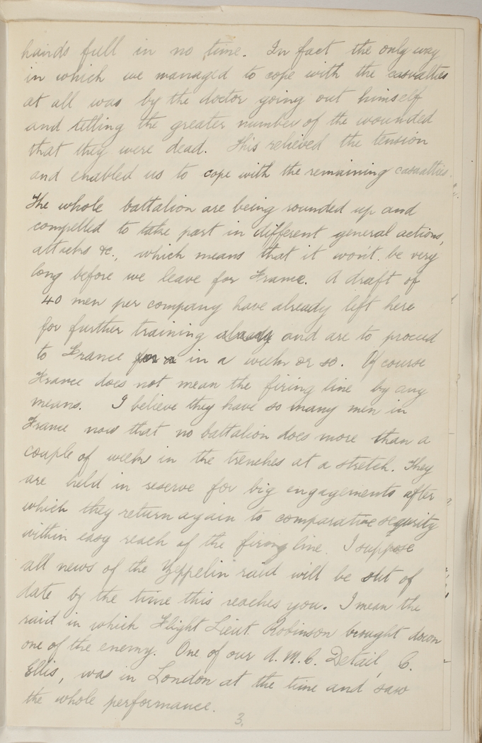 I suppose all news of the Zeppelin raid will be out of date by the time this reaches you. I mean the raid in which Flight Lieut. Robinson brought down one of the enemy. One of our A.M.C. Detail, C. Ellis, was in London at the time and saw the whole performance.