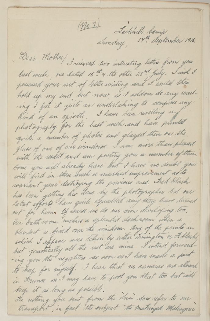 I received two interesting letters from you last week, one dated 16th. & the other 23rd.July. I wish I possessed your art of letter writing and I could then hold up my end, but now as I seldom do any reading I feel it is quite an undertaking to compose any kind of an epistle. I have been revelling in photography for the last weeks and have printed quite a number of photos and glazed them on the glass of one of our windows. I am more than pleased with the result and am posting you a number of them. Some you will already have but I have no doubt you will find in these such a marked improvement as to warrant your destroying the previous ones. Fred Clark has been getting his done by the photographer but our latest efforts have quite equalled any they have turned out for him. Of course we do our own developing too. Our bathroom makes a splendid darkroom when a blanket is fixed over the window. Any of the prints in which I appear were taken by either Simington or F. Clark, but practically all the rest are mine. I intend forwarding you the negatives as soon as I have made a print to keep for myself. I hear that no cameras are allowed in France so I may have to post you that too but will keep it as long as possible.