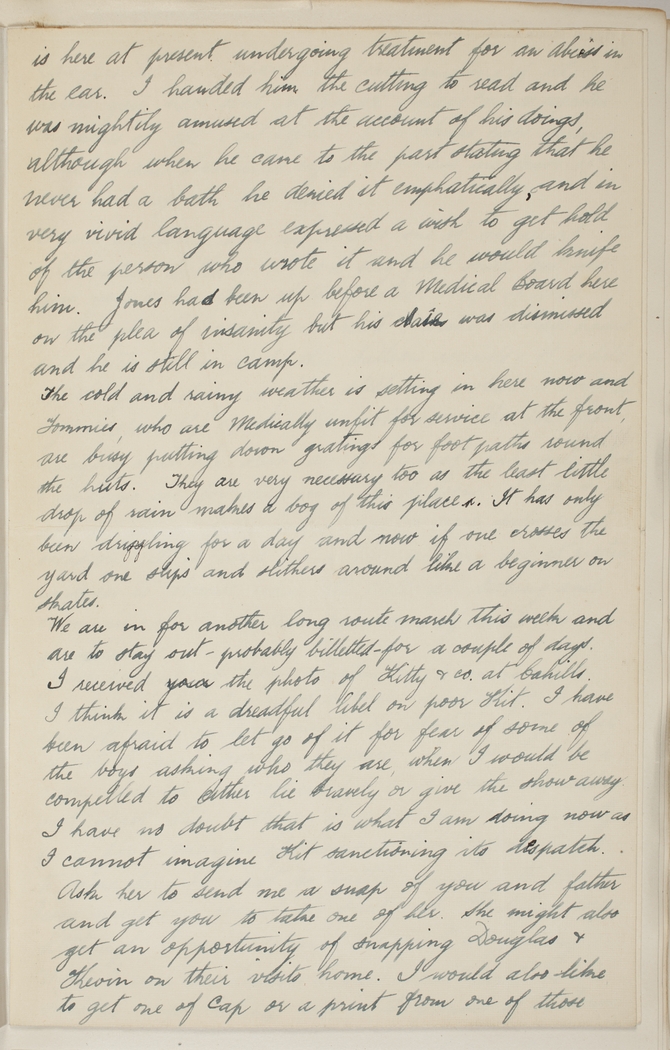 is here at present undergoing treatment for an Abcess in the ear. I handed him the cutting to read and he was mightily amused at the account of his doings, although when he came to the part stating that he never had a bath he denied it emphatically, and in vivid language expressed a wish to get hold of the person who wrote it and he would knife him. Jones had been up before a Medical Board here on the plea of insanity but his case was dismissed and he is still in camp.
