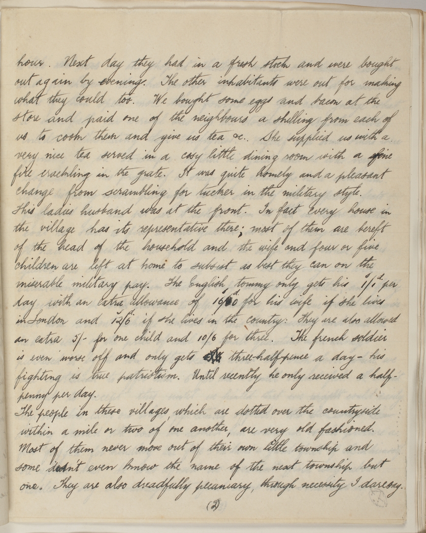 16s/10d for his wife if she lives in London and 12s/6d is she lives in the country. They are also allowed an extra 5/- for one child and 10/6 for three. The french soldier is even worse off and only gets three-halfpence a day - his fighting is true patriotism. Until recently he only received a half-penny per day.