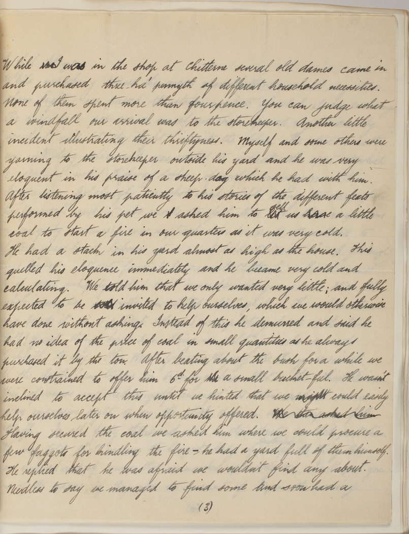 Instead of this he demurred and said he had no idea of the price of coal in small quantities as he always purchased it by the ton. After beating about the bush for a while we were constrained to offer him 6d. for a small bucket-ful. He wasn't inclined to accept this until we hinted that we could easily help ourselves later on when opportunity offered. Having secured the coal we asked him where we could procure a few faggots for kindling the fire - he had a yard full of them himself. He replied that he was afraid we wouldn't find any about. Needless to say we managed to find some and soon had a