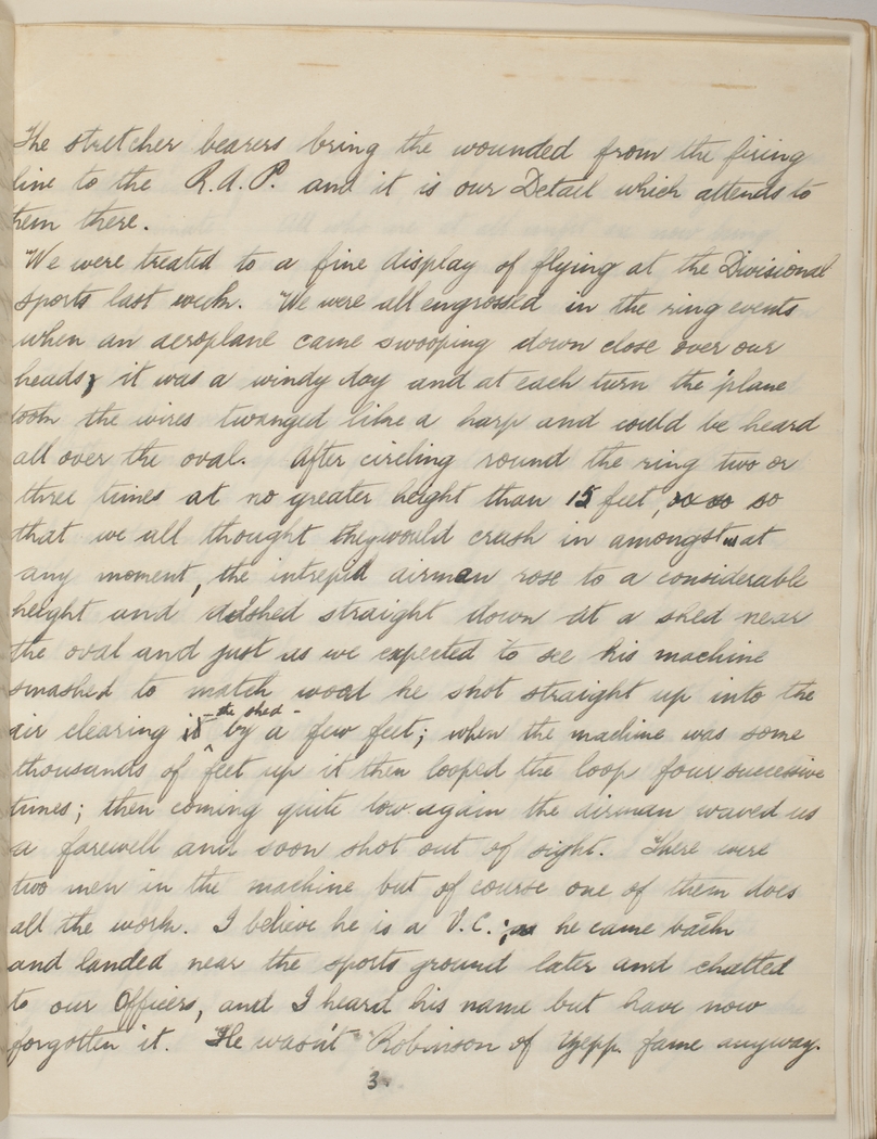We were treated to a fine display of flying at the Divisional Sports last week. We were all engrossed in the ring events when an aeroplane came swooping down close over our heads, it was a windy day and at each turn the plane took the wires twanged like a harp and could be heard all over the oval. After circling round the ring two or three times at no greater height then 15 feet, so that we all thought they would crash amongst us at any moment, the intrepid airman rose to a considerable height and dashed straight down at the shed near the oval and just as we expected to see his machine smashed to match wood he shot up into the air clearing the shed by a few feet; when the machine was some thousands of feet up it then looped the loop four successive times; then coming quite low again the airman waved us a farewell and soon shot out of sight. There were two men in the machine but of course one of them does all the work. I believe he is a V.C.; as he came back and landed near the sports ground later and chatted to our Officers, and I heard his name but have now forgotten it. He wasn't Robinson of Zepp fame anyway