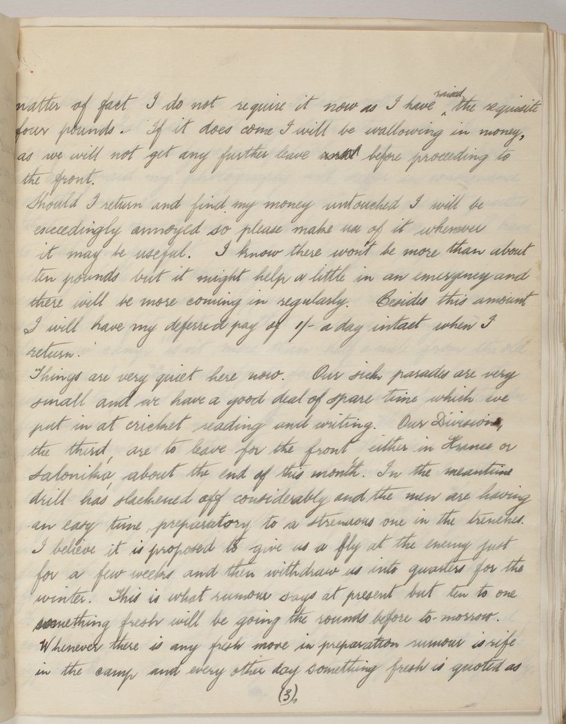 Things are very quiet here now. Our sick parades are very small and we have a great deal of spare time which we put in at cricket reading and writing. Our Division, the third, are to leave for the front either in France or Salonika, about the end of this month. In the meantime drill has slackened off considerably and the men are having an easy time preparatory to a strenuous one in the trenches. I believe it is proposed to give us a fly at the enemy just for a few weeks and then withdraw us into quarters for the winter. This is what rumour says at present but ten to one something fresh will be going the rounds before to-morrow. Whenever there is any fresh move in preparation rumour is rife in the camp and every other day something fresh is quoted as