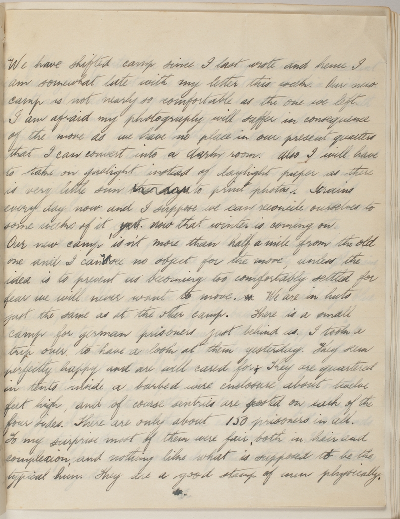 We have shifted camp since I last wrote and hence I am somewhat late with my letter this week. Our new camp is not nearly so comfortable as the one we left. I am afraid my photography will suffer in consequence of the move as we have no place in our present quarters that I can convert into a dark room. Also I will have to take on gaslight instead of daylight paper as there is very little sun these days to print photos. It rains every day now and I suppose we can reconcile ourselves to some weeks of it, now that winter is coming on.