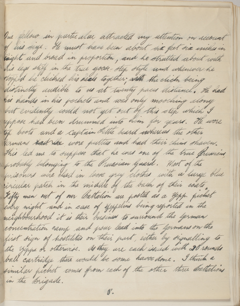 Fifty men out of our Battalion were posted as a Zepp picket every night and in case of Zepplins being reported in the neighbourhood it is their business to surround the German concentration camp and pour lead into the Germans on the first sign of hostilities on their part, either by signalling to the Zepps or otherwise. As they are each issued with 20 rounds of ball cartridge there would be some havoc done. I think a similar picket comes from each of the other three Battalions in the Brigade.