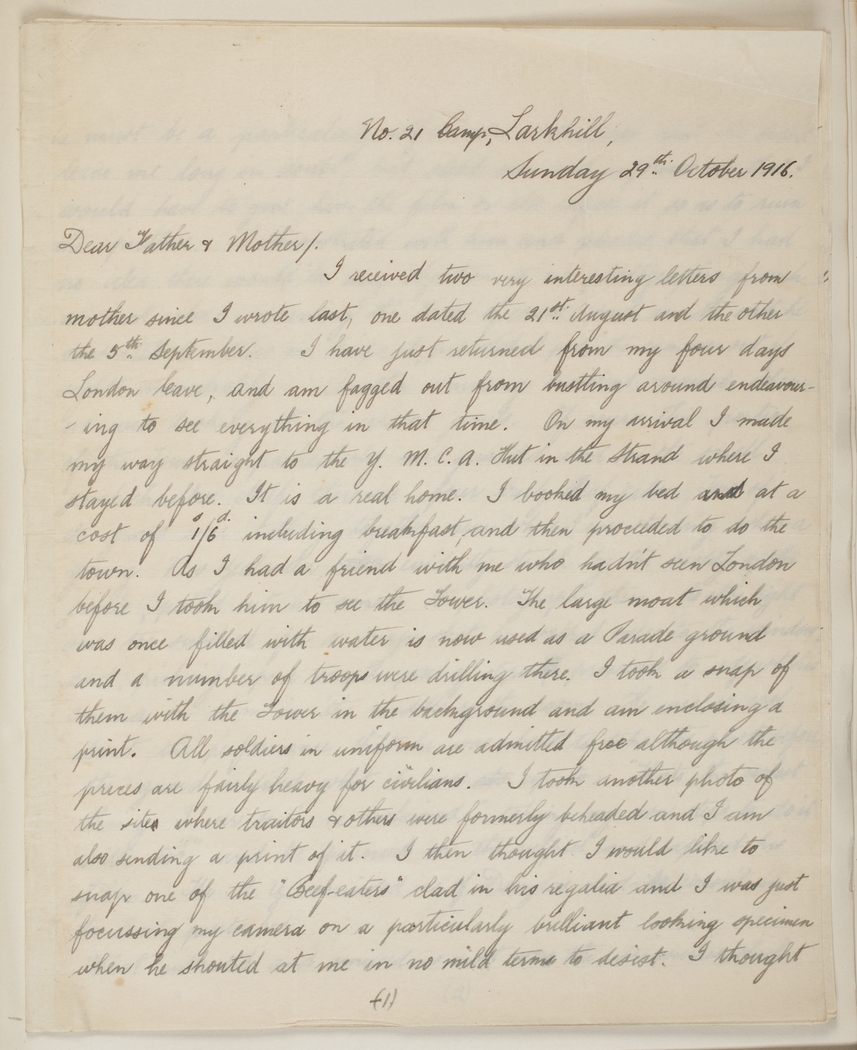 I received two very interesting letters from mother since I wrote last, one dated the 21st. August and the other the 5th.September. I have just returned from my four days London leave, and am fagged out from bustling around endeavouring to see everything in that time.