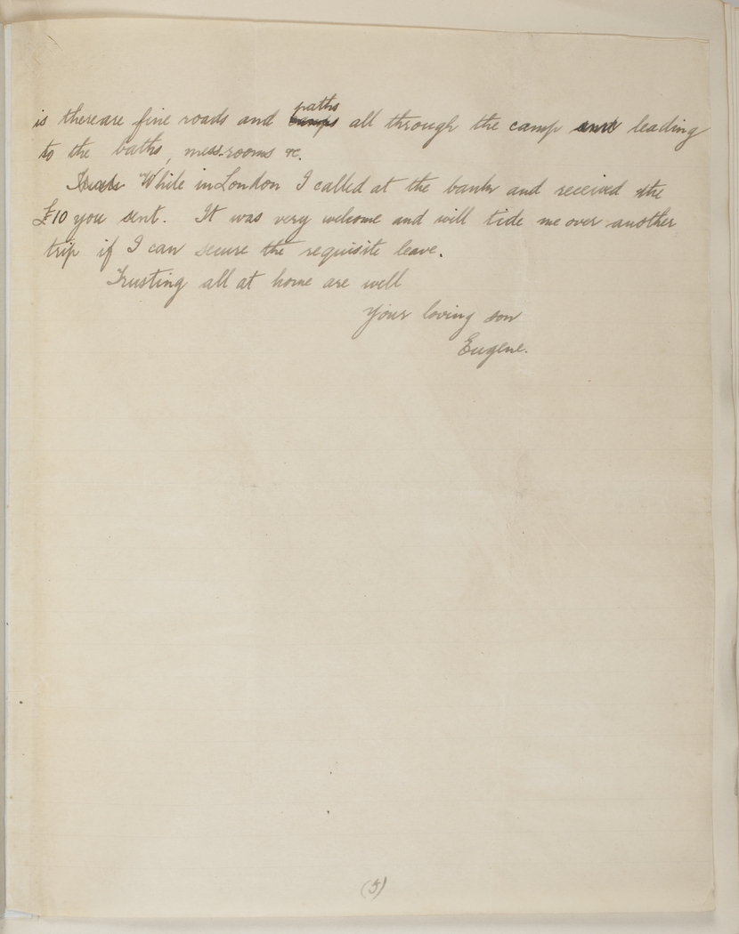 While in London I called at the bank and received the £10 you sent. It was very welcome and will tide me over another trip if I can secure the requisite leave.