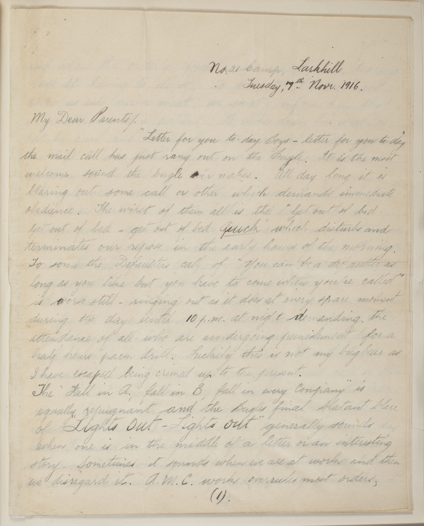 The "Fall in A. fall in B, fall in every Company" is equally repugnant and the Bugles final blatant blare of "Lights Out - Lights Out" generally sounds when one is in the middle of a letter or an interesting story. Sometimes it sounds when we are at work and then we disregard it. A.M.C. work overrules most orders,