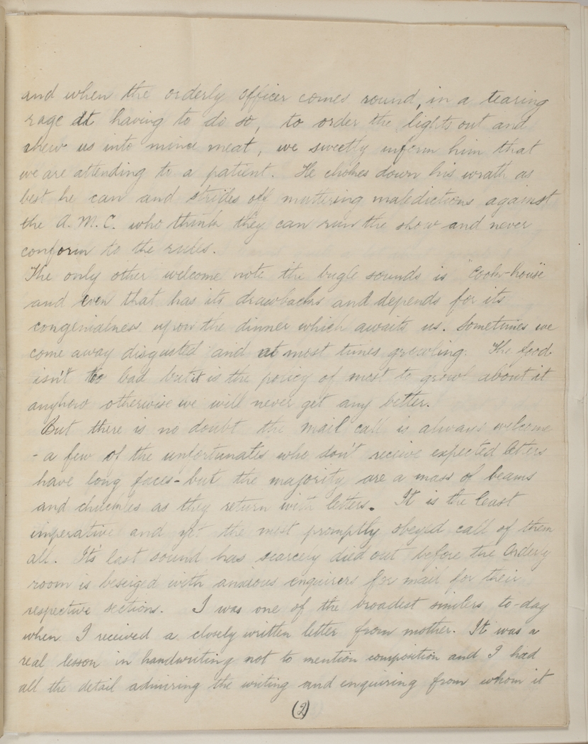 But there is no doubt the Mail call is always welcome - a few of the unfortunates who don't receive expected letters have long faces - but the majority are a mass of beams and chuckles as they return with letters. It is the least imperative and yet the most promptly obeyed call of them all. It's last sound has scarcely died out before the Orderly room is beseiged with anxious enquirers for mail for their respective sections. I was one of the broadest smilers to-day when I received a closely written letter from mother. It was a real lesson in handwriting not to mention composition and I had all the detail admiring the writing and enquiring from whom it