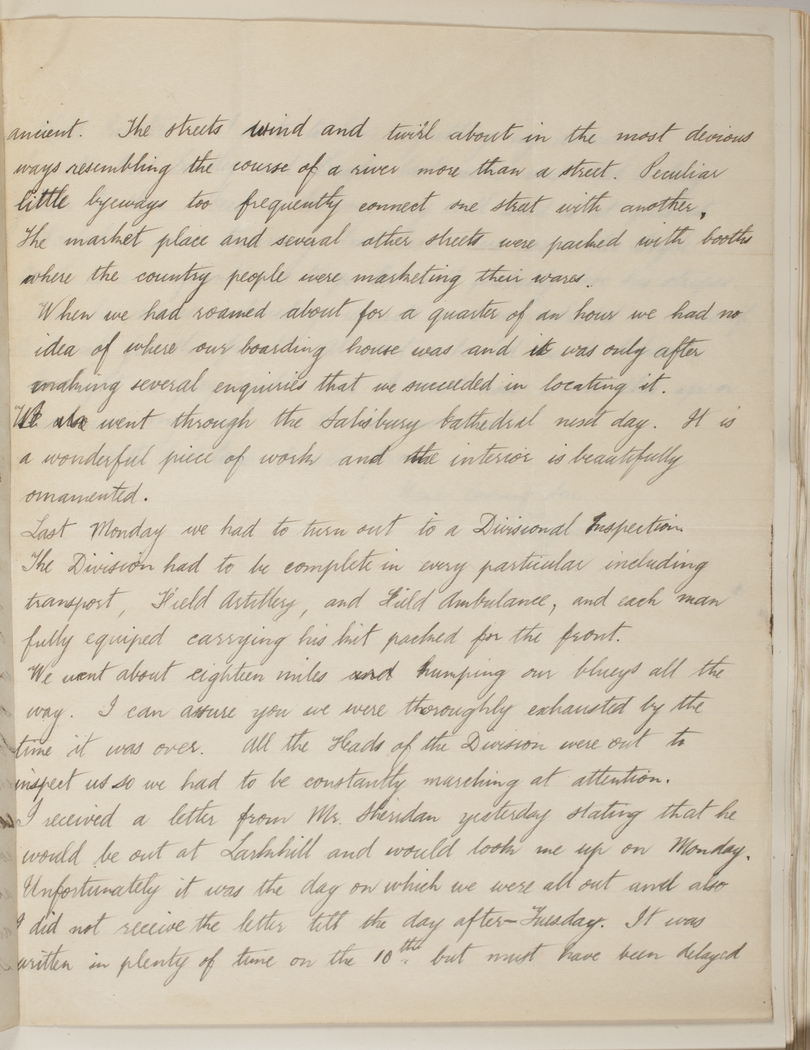 I received a letter from Mr. Sheridan yesterday stating that he would be out at Larkhill and would look me up on Monday. Unfortunately it was the day on which we were all out and also I did not receive the letter till the day after - Tuesday. It was written in plenty of time on the 10th. but must have been delayed