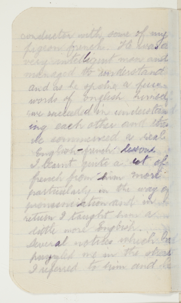 conductor with some of my pigeon french. He was a very intelligent man and managed to understand and as he spoke a few words of English himself, we succeeded in understanding each other and then we commenced a real English - french lesson. I learnt quite a lot of french from him more particularly in the way of pronunciation and in return I taught him a little more English.