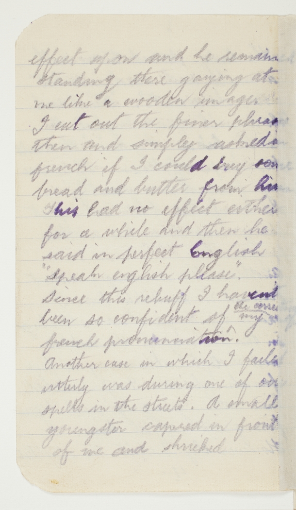 effect upon and he remained standing there gazing at me like a wooden image. I cut out the finer phrases then and simply asked in french if I could buy some bread and butter from him. This had no effect either for a while and then he said in perfect English "Speak english please." Since this rebuff I haven't been so confident of the correctness of my french pronunciation.